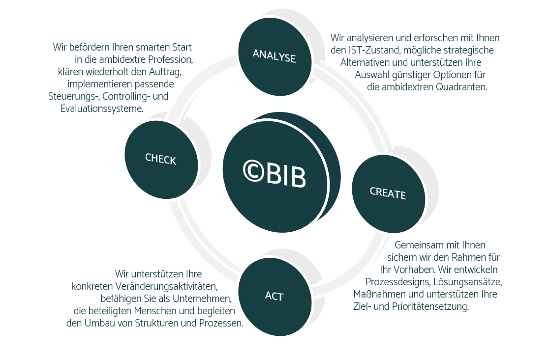 Der ©BIB | Business in Balance umfasst unsere generelle Herangehensweise zur Implementierung bzw. Weiterentwicklung des Ambidextren Managements in Unternehmen. Als Methodik umfasst der ©BIB vier Handlungsfelder (ANALYSE, CREATE, ACT, CHECK) und vier inhaltliche Matrizen (Aufträge, Themen, Rollen, Stellhebel für das Management).