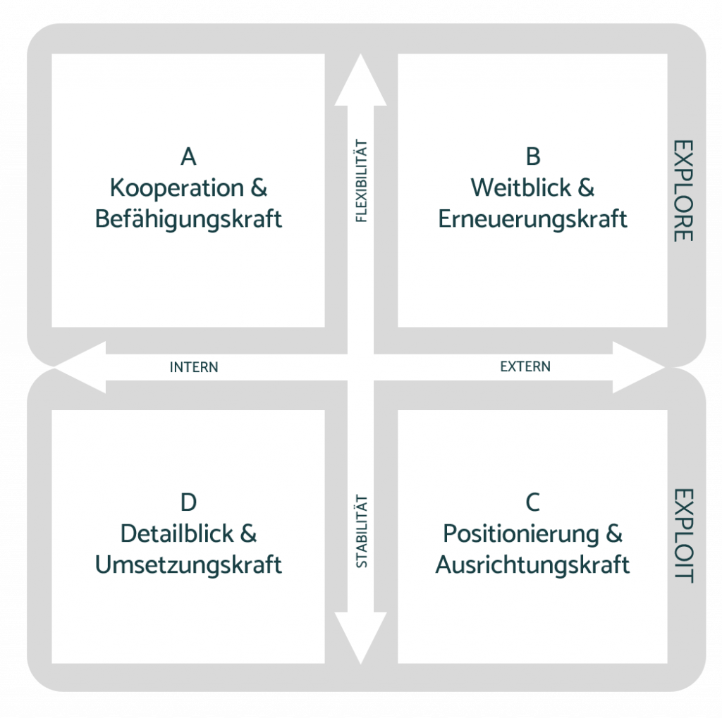 Kombinieren wir die Aspekte „Exploit-Stabilität“ und „Explore-Flexibilität“ mit den Perspektiven „unternehmensintern“ (Interaktion und Abläufe) und „unternehmensextern“ (Markt und Zukunft) formieren sich vier Quadranten mit unterschiedlichen Aufgaben.
