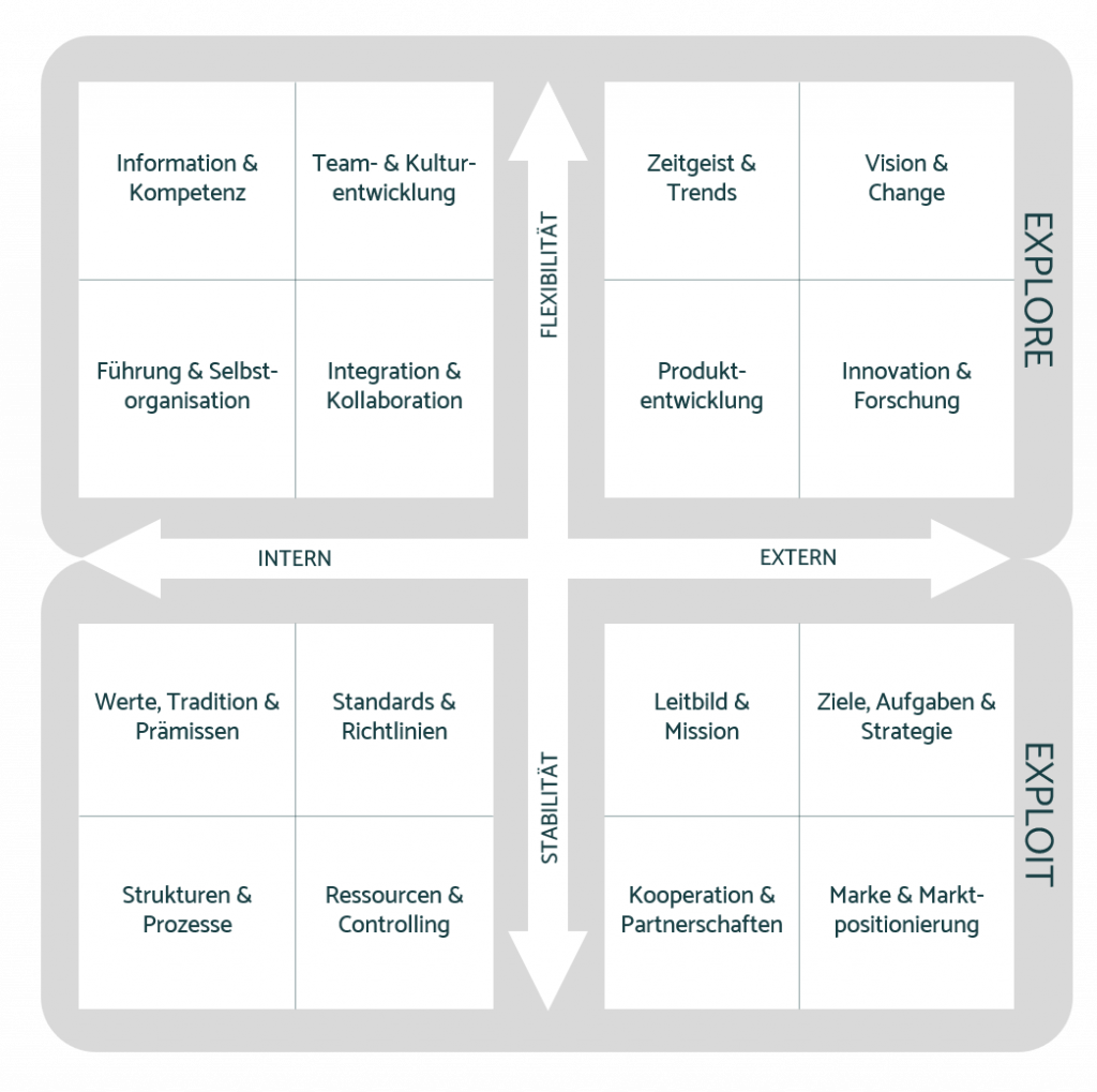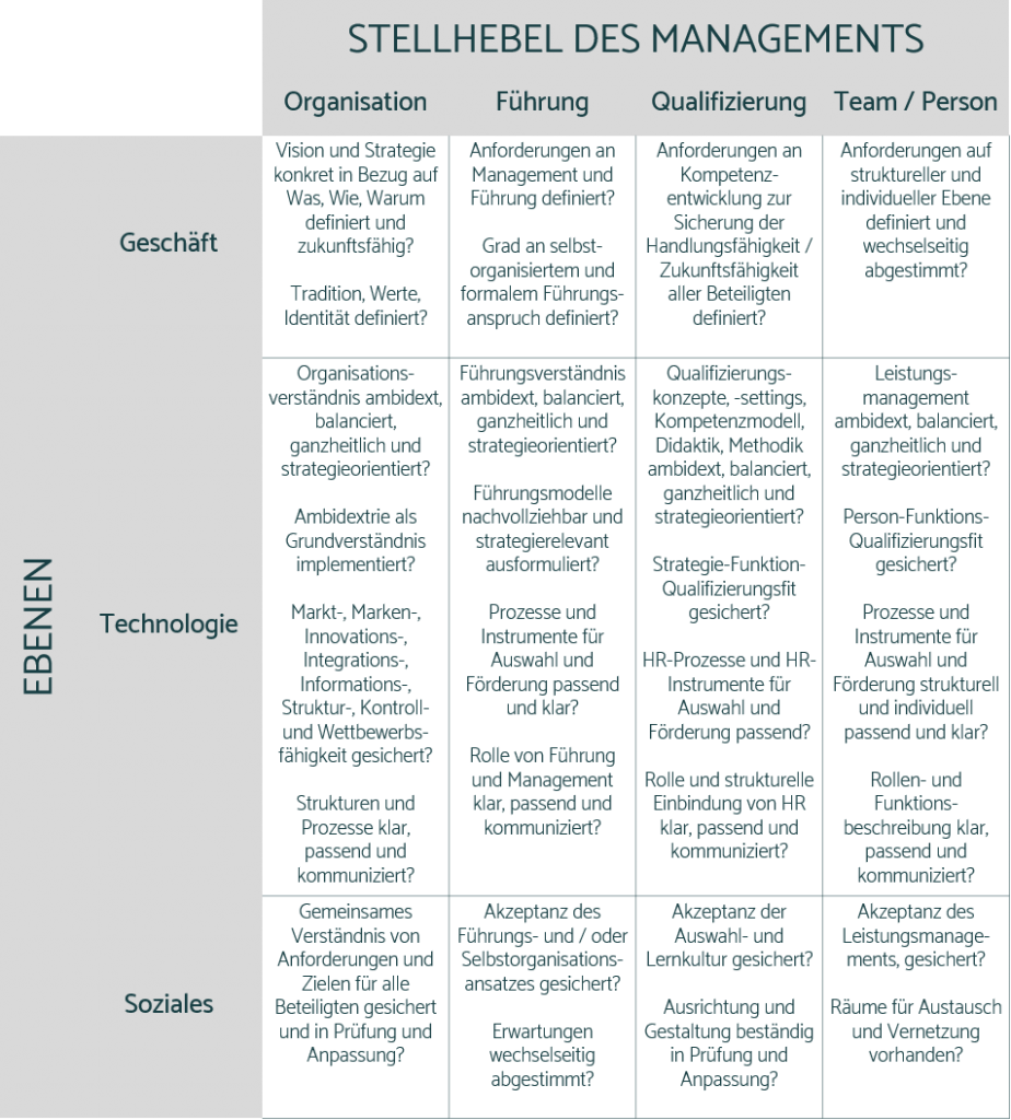 Die vier zuvor aufgeführten Quadranten definieren potenzielle Themen der Organisations- und Personalentwicklung gemäß des Ambidextriegedankens. Die Herausforderungen können allerdings auch in klassischen Kategorien über Fragstellungen beschrieben werden.