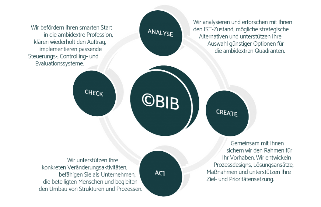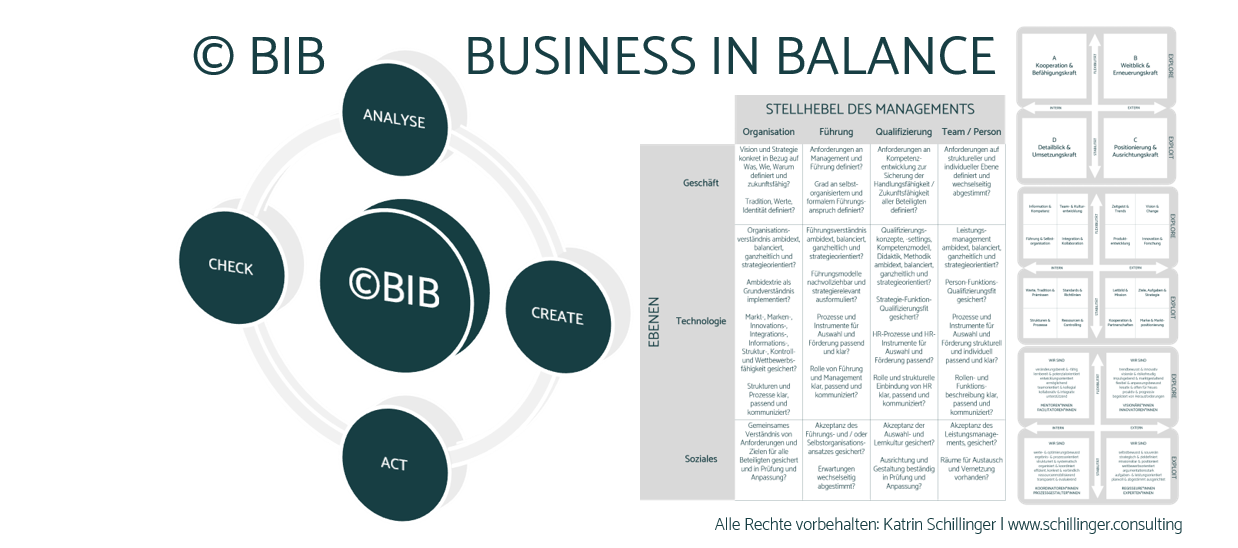 Der ©BIB | Business in Balance beschreibt unsere Systematik zur Implementierung bzw. Weiterentwicklung des Ambidextren Managements in Unternehmen. Sie wurde von uns auf die Anforderungen des ambidextren Konzepts abgestimmt und umfasst als Methodik