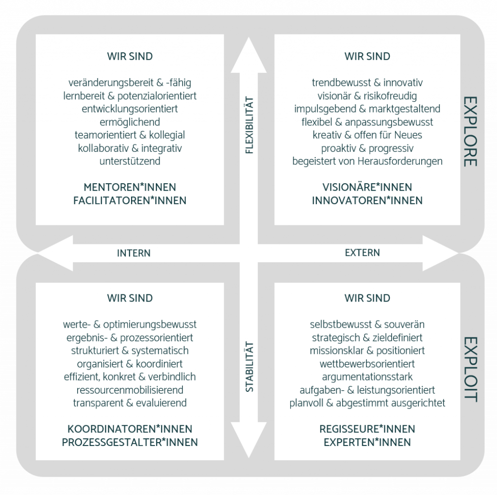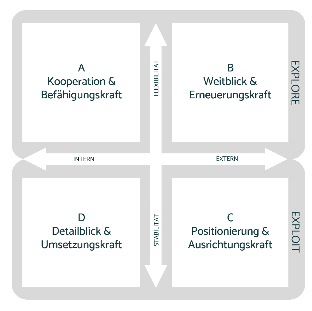 Kombinieren wir die Aspekte „Exploit-Stabilität“ und „Explore-Flexibilität“ mit den Perspektiven „unternehmensintern“ (Interaktion und Abläufe) und „unternehmensextern“ (Markt und Zukunft) formieren sich vier Quadranten mit unterschiedlichen Aufgaben. Dank der Forschung wissen wir, dass Unternehmen umso erfolgreicher sind, desto ausgereifter alle Quadranten gleichermaßen sind. Investitionen in das Über-Sich-Hinauswachsen aller Beteiligten des Unternehmens lohnen sich also sehr und explizit auch in wirtschaftlicher Hinsicht.