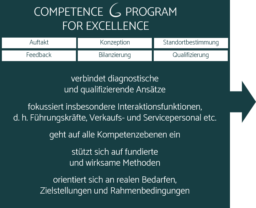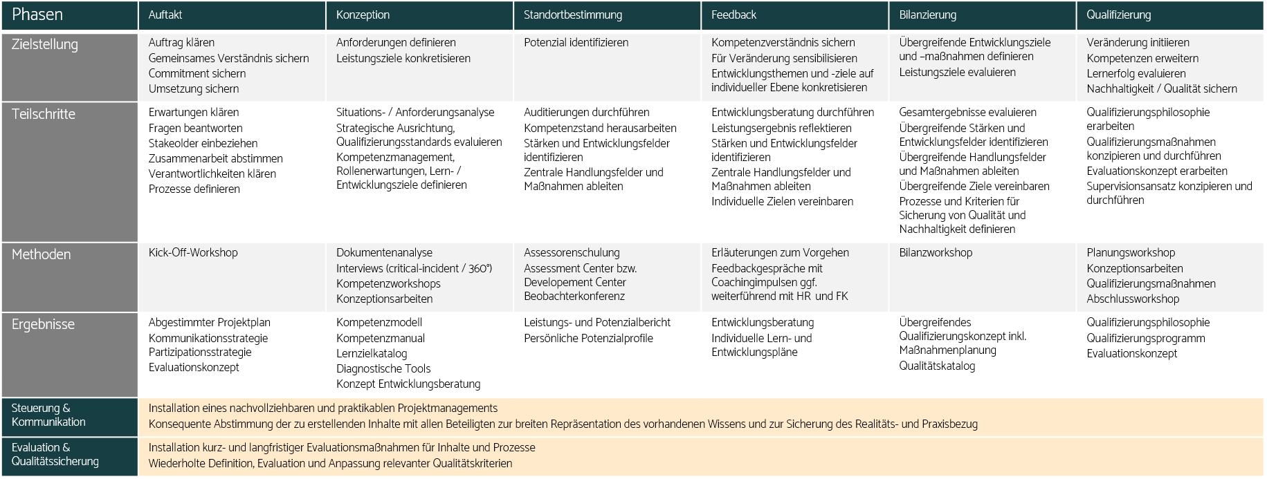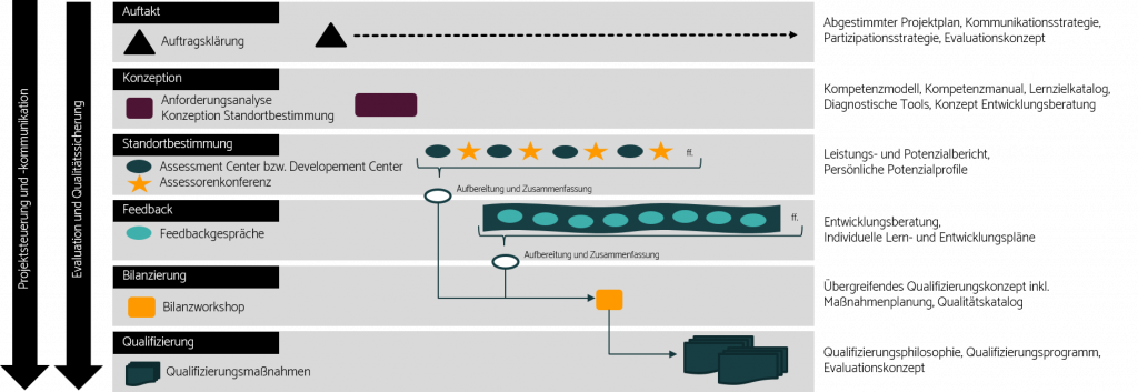 20 Jahre Beratungs- und Konzeptionserfahrungen ermöglichen uns, sie umfassend bezüglich möglicher Alternativen im Rahmen der Diagnostik und der Qualifizierung zu beraten. Wir unterstützen als neutrale Instanz die Konzeption und Durchführung der Maßnahmen… von einzelnen Potenzialanalysen mit entwicklungsorientiertem Feedback, Workshops und Coachings, bis hin zum Strategischen Kompetenz- und Wissensmanagement, Blended-Learning-Ansätzen und Qualifizierungsstrategien etc.