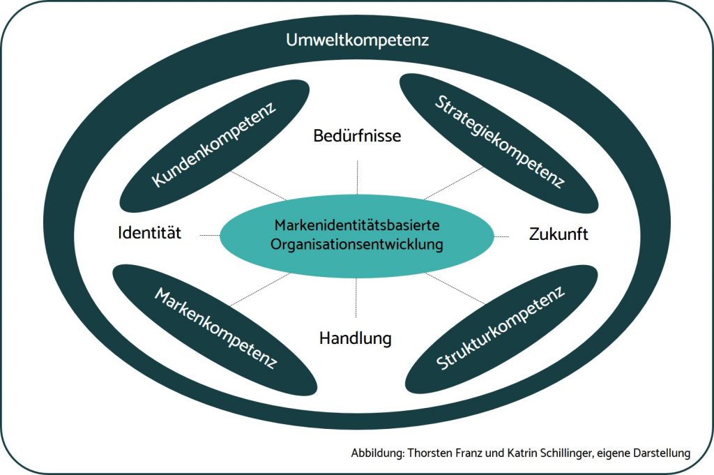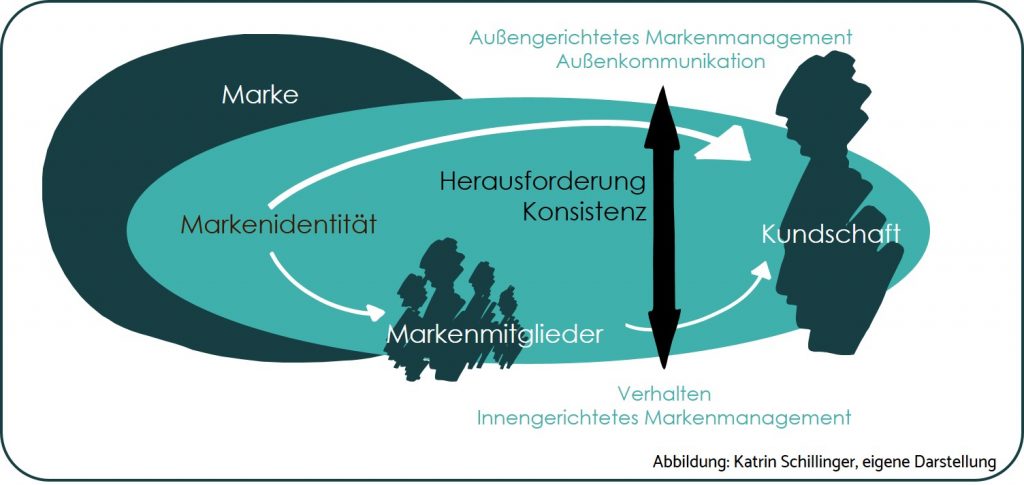 Die Marke und ihre Identität sind kein Objekt bzw. hypothetisches Konstrukt, die vom „grünen Tisch“ aus gesteuert, über Außenkommunikation in die Köpfe der Kundschaft oder der eigenen Mitarbeiterschaft eingepflanzt wird. Sie muss nicht nur im Bewusstsein im Außen der Organisation, sondern genauso klar im Innen erfahrbar und erlebbar sein, mit allen Konsequenzen für z.B. Haltung, Prozesse oder Führung. Es um individuelle und organisationale Handlungskompetenzen in den Bereichen „Kunden“, „Strategie“, „Marke“ und „Struktur“, damit auch Begriffe wie Customer Experience oder Kundenorientierung keine Worthülsen und Lippenbekenntnisse bleiben. Markenarbeit in diesem Sinne ist somit eine zwingend verhaltensorientierte, integrative und strukturübergreifende Arbeit, eine notwendige Identitäts- Kompetenz- und Kulturarbeit in und mit der Organisation und den beteiligten Menschen.
